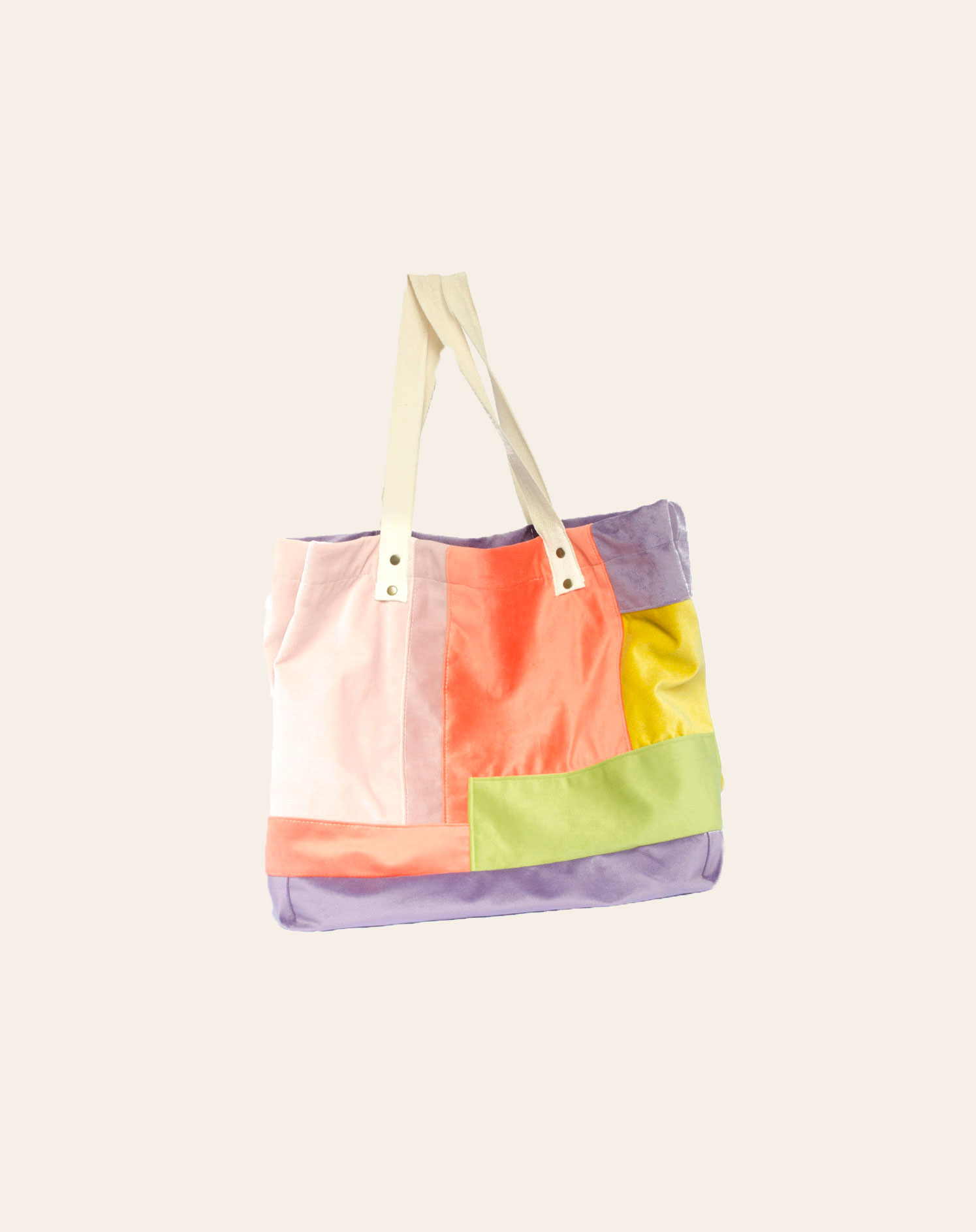 Los estampados son únicos, varían según los recortes de descartes, combinados entre los colores: lavanda, naranja, pistachio y rosa.